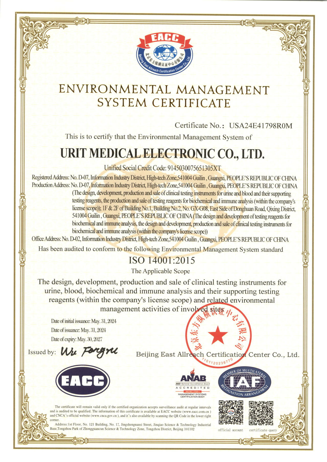 Celebrating: URIT has achieved the ISO14001 Environmental Management System Certification!